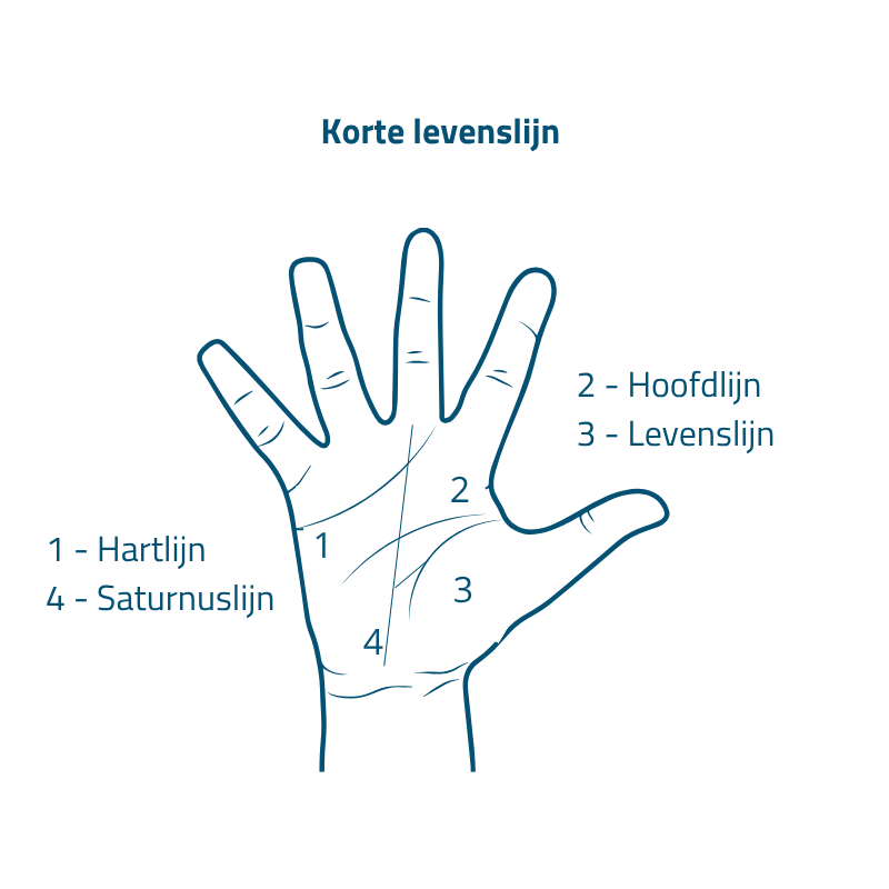 Mensen denken vaak dat je bij een korte levenslijn een kort leven hebt. Dat is absoluut niet waar, de levenslijn gaat niet over de lengte van je leven. Het gaat over je levensenergie, je levenslust en je wilskracht. Een korte levenslijn kan dus wel iets zeggen over je energie. Het kan betekenen dat je gedurende de dag minder energie hebt, of dat je het lastig kan vinden om een doel te stellen of toekomstplannen te maken.