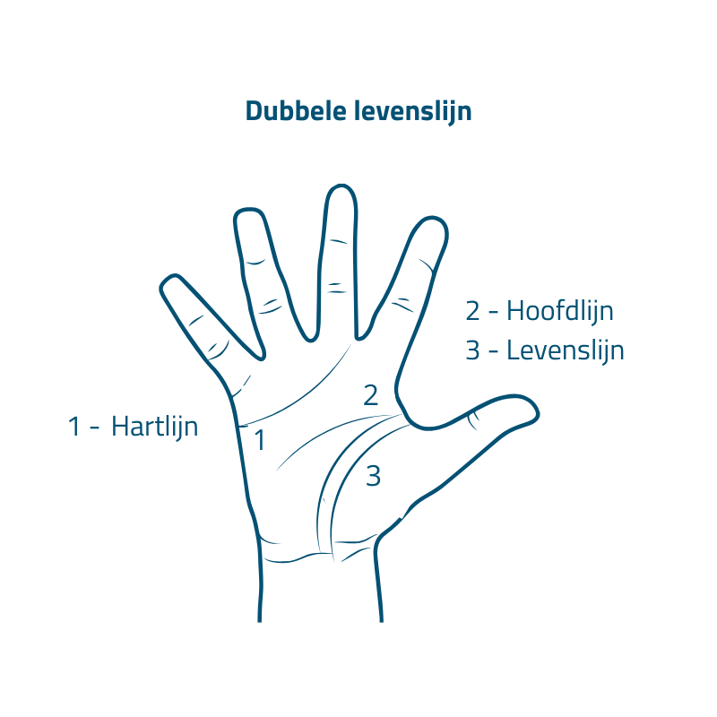 Een dubbele levenslijn kan staan voor 2 sporen, een binnen- en een buitenspoor. Een huiselijke kant en een wat meer uitbundige naar buitengaande kant. Vaak bewandelt deze persoon 2 paden. Een dubbele levenslijn zou je kunnen tegenkomen bij iemand die geadopteerd is. Er zijn dan 2 verhalen. Je kunt een dubbele levenslijn ook tegenkomen bij een tweeling, of iemand die onderdeel is geweest van een tweeling in de baarmoeder.
